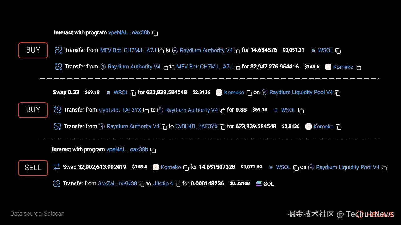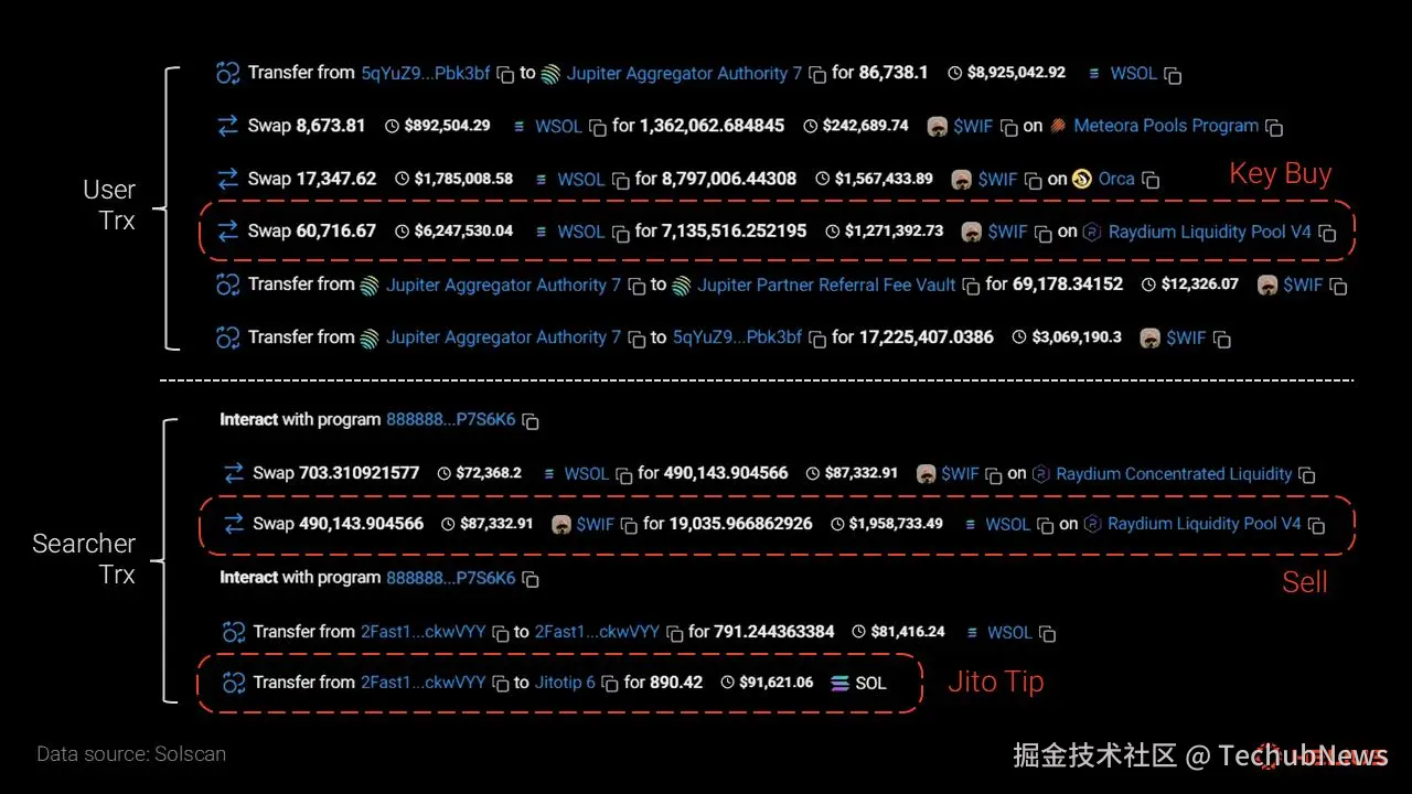 这次攻击发生在2024年12月16日,通过一个著名的三明治攻击程序(vpeNALD… Noax38b)进行。搜索者将这些交易作为原子性的 Jito 捆绑包提交,并支付了0.000148 枚 SOL(约 0.03 美元)的小费。