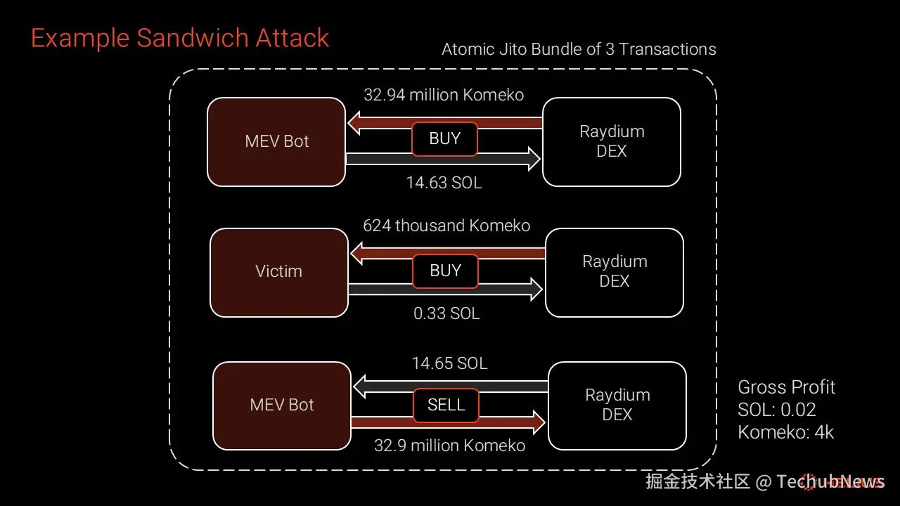 上图:一个典型的三明治攻击的可视化。攻击者在受害者的买入交易前后,分别进行抢先交易和尾随交易以获利。