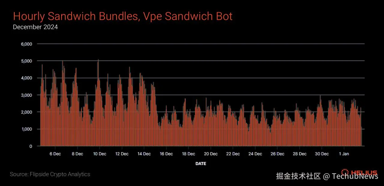 上图: Vpe 三明治交易程序每小时发起的三明治交易捆绑包数量 (数据来源:Flipside crypto analytics、Marqu)