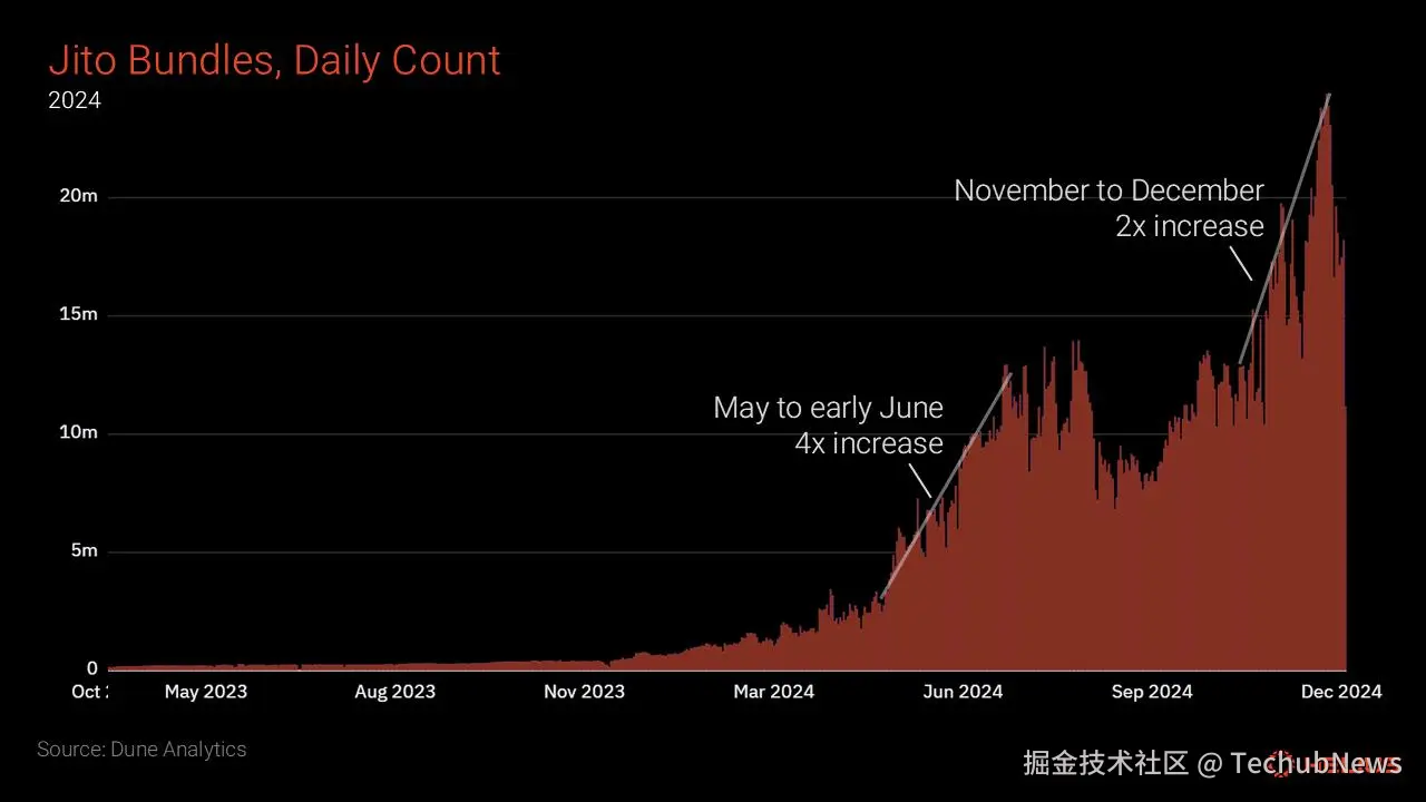 2024 年全年,通过 Jito 处理的捆绑包数量持续增长,最终在 12 月 21 日达到 2440 万个捆绑包的峰值。这一增长包括两次显著激增。第一次激增发生在 5 月至 7 月初之间,每日捆绑包数量从大约 300 万个增加到 1200 万个,这可能是对网络拥堵问题的回应。第二次激增发生在 11 月至 12 月期间,每日捆绑包数量从大约 1200 万个翻倍至峰值的 2400 万个。