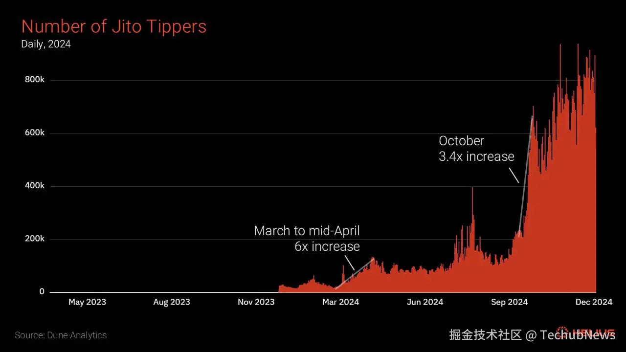 这一期间,使用 Jito 的账户数量也呈现出平行上升的趋势,年初时每日大约有 2 万个小费支付者,12 月 10 日达到近 93.8 万个的峰值。显著增长期包括从 3 月初的 2.1 万个增长到 4 月中旬的 13.5 万个(增长了 6 倍),以及从 10 月的 20.8 万个大幅增加至月底的 70.3 万个(增长了 3.4 倍)。