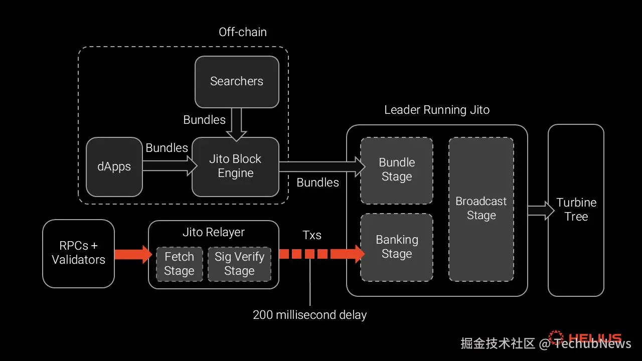 上图:当前的 Jito 架构包括一个接受搜索者提交的捆绑包的区块引擎和一个延迟向领导者发送传入交易的中继器