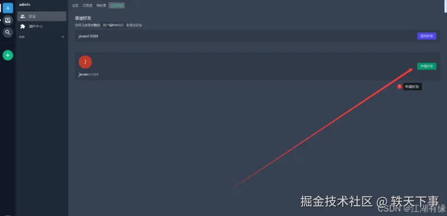 可以看到已经查询到 jeven 用户,点击“申请好友”。