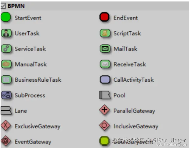 2.1.BPMN(Business Process Modeling Notation,即业务流程建模符号):是一种流程建模的通用和标准语言,用来绘制业务流程图,以便更好地让各部门之间理解业务流程和相互关系。