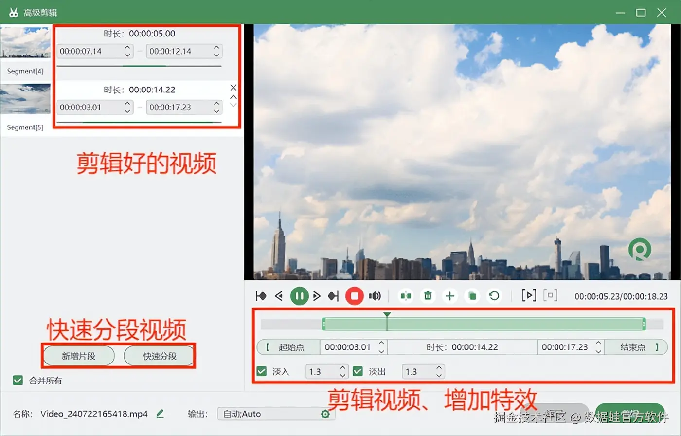 步骤3:录制结束后,可以在高级剪辑页面内对视频进行剪辑、快速分段、添加特效等后期处理。