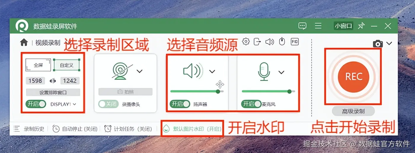 步骤2:自定义录制区域、录制声音(扬声器声音、麦克风声音)、还可以自由设置水印等参数。设置完毕点击“REC”按钮开始录制,录制过程中可通过快捷键控制暂停、恢复和停止。