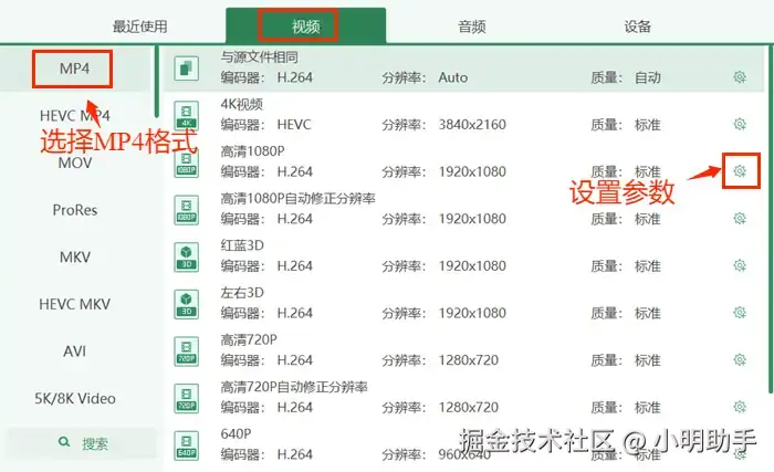 第三步:点击界面中的【视频】按钮,选择MP4格式。也可以点击界面右侧小齿轮图标,设置自定义格式参数。