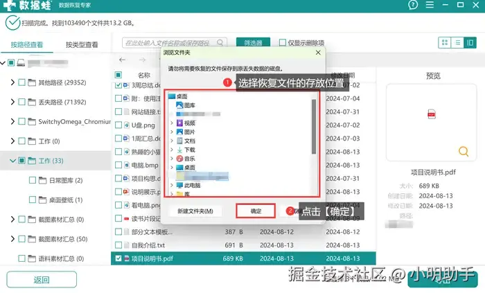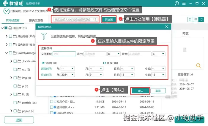步骤2: 扫描结束后,可以借助一些工具(如搜索框、筛选器等),帮助自己更快找到丢失的文件;选好后点击【导出】;
