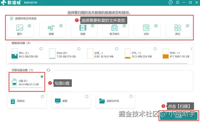 步骤1: 打开数据 蛙恢复专家,在软件的首页选择好需要恢复的文件类型和U盘(需要在打开软件之前,就将U盘与电脑实现连接),最后点击【扫描】;