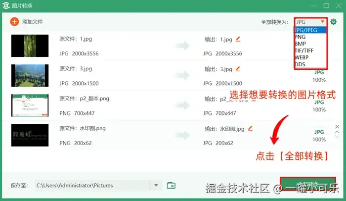 步骤3:点击转换列表上的格式选择框,选择想要转换的图片格式,然后点击【全部转换】按钮即可。