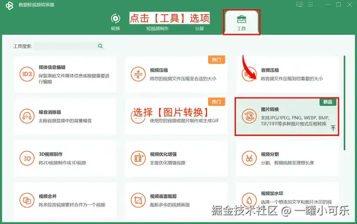 步骤1:打开并启动数据 蛙视频转换器,点击界面上的【工具】选项,然后选择【图片转换】功能。