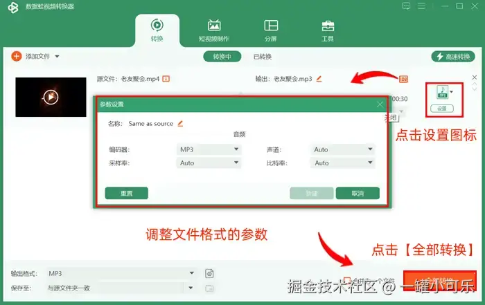 步骤3:在格式转换界面中,点击MP4转换MP3列表中的设置图标,调整文件格式的参数,然后点击【全部转换】即可。