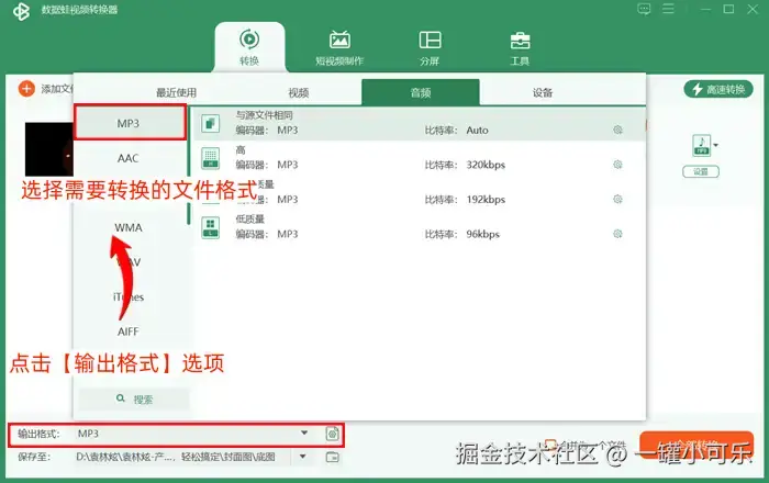 步骤2:点击界面底部的【输出格式】选项,选择需要转换的文件格式,即【MP3】格式。