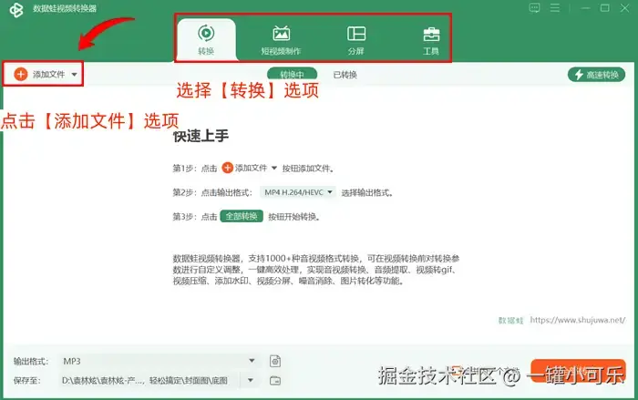 MP4格式怎么转换成MP3格式?数据 蛙视频转换器它支持多种视频和音频格式之间的转换,可以看作是一款mp4转换mp3格式转换器。这款应用的优点是转换速度快,能够批量处理文件,节省用户时间;还支持编辑MP4或MP3文件格式的相关参数,尽可能地输出高质量的音频文件。下面介绍具体的操作步骤。