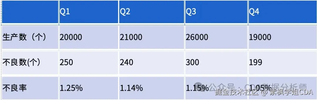 例:已知某产品每个季度的不良率,求全年度平均不良率。