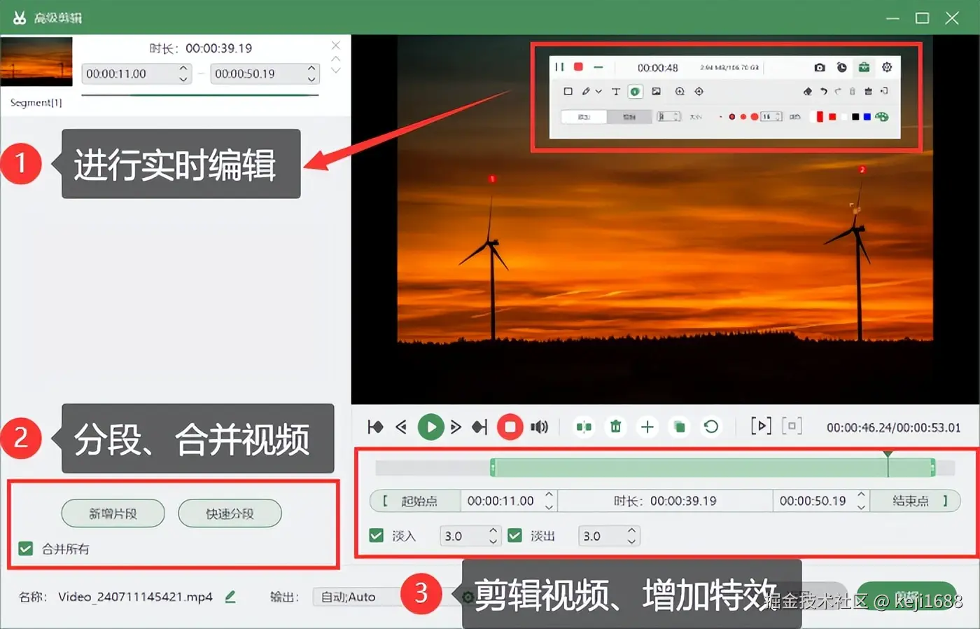 步骤2:录制的过程中支持对视频进行实时编辑操作,录制完成后,你可以在软件内直接预览、剪辑和导出视频文件。