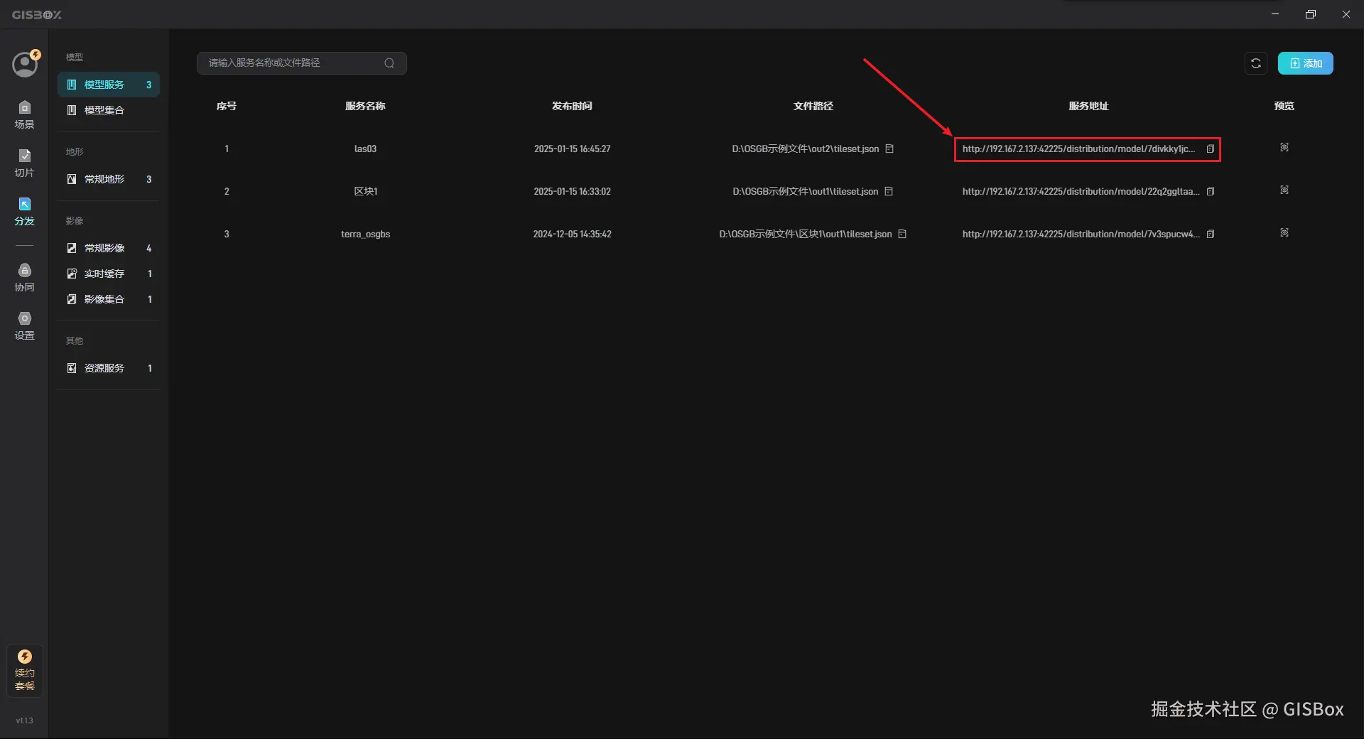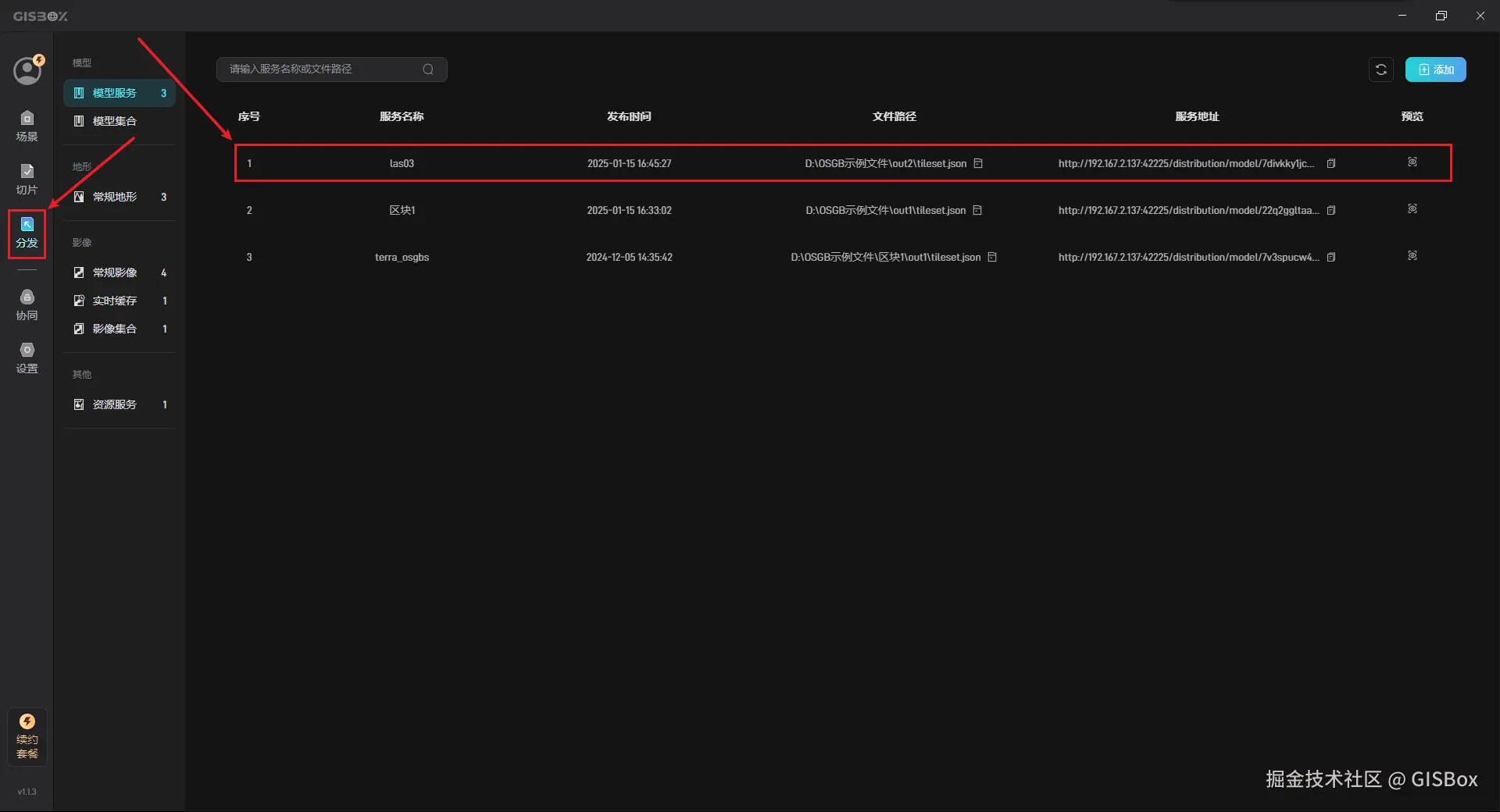 4. 切片完成后,点击左侧 “分发” 按钮,可以在 “模型服务” 中看到切片完成后自动发布的服务。
