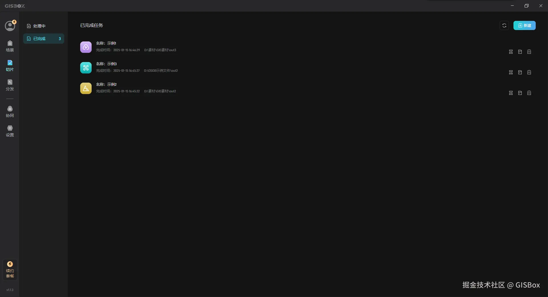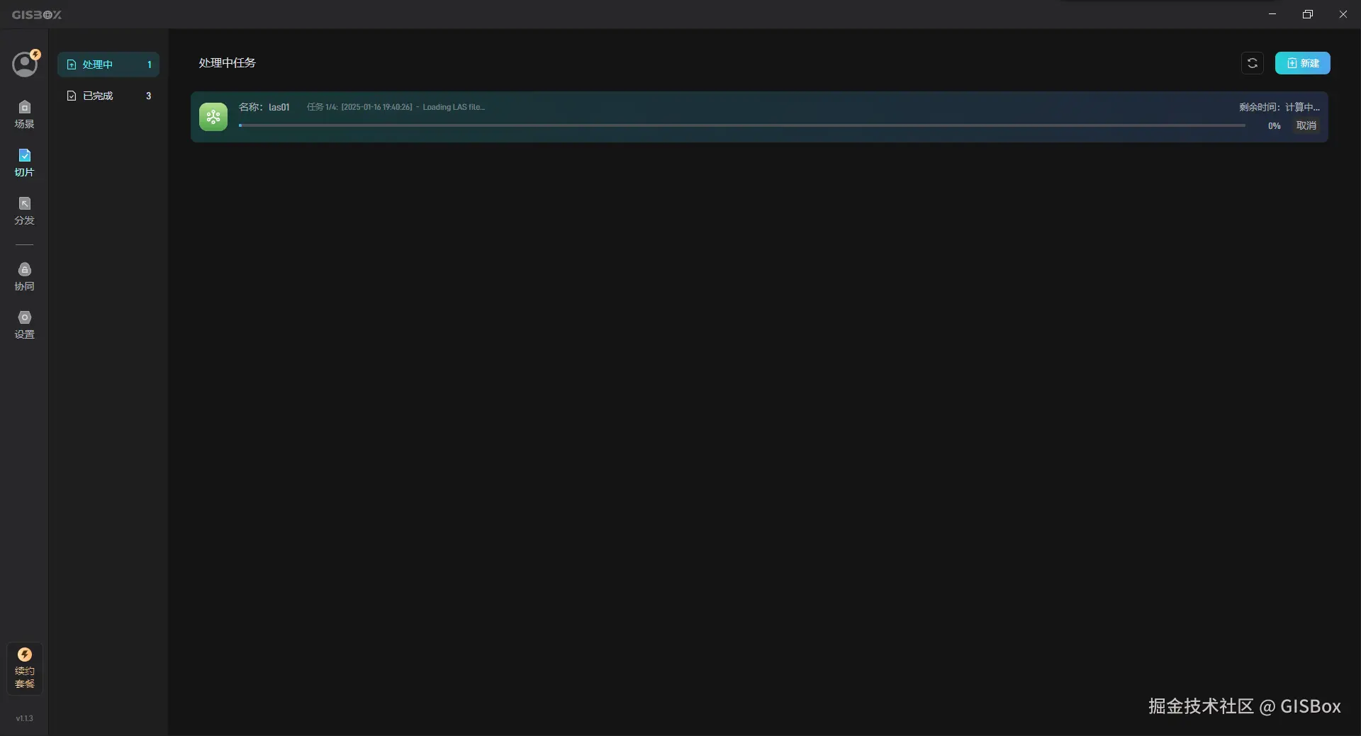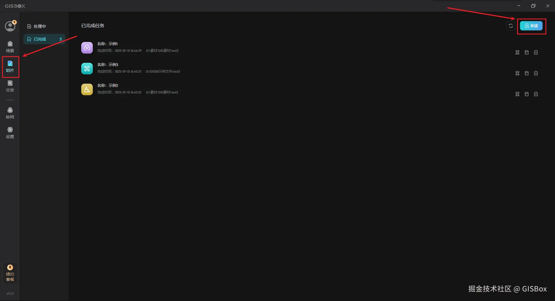 - 打开GISBox软件,点击左侧按钮切换到 “切片” 功能,然后点击右上方的 “新建” 按钮创建一个切片任务。
