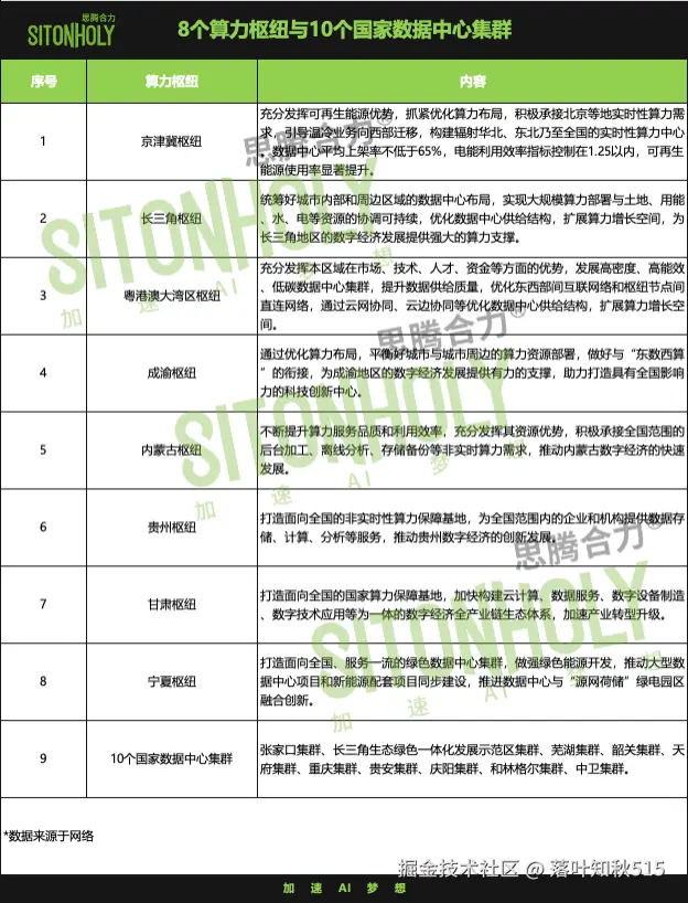 智算中心的发展是通算中心(传统数据中心)升级演进的必然趋势。随着人工智能技术的广泛应用,通算中心已逐渐无法满足日益增长的计算需求。智算中心应运而生,支持大规模的数据处理和智能算法运算,成为推动数字经济发展的关键力量。从全国算力地图来看, “东数西算” 工程规划了八大算力枢纽和十大集群,涵盖了京津冀、内蒙古、甘肃、长三角、贵州、粤港澳、成渝等地区。这些地区将成为我国算力网络的重要节点,通过高速网络连接,实现数据的高效传输和算力的协同调度。信息来源于网络