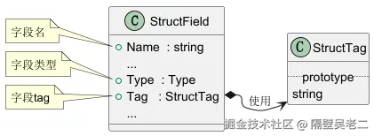 前面说过, Tag 只有在反射场景中才有用,而反射包中提供了操作 Tag 的方法。在说方法前,有必要先了解一下 Go是如何管理struct字段的。以下是 reflect 包中的类型声明,省略了部分与本文无关的字段。
