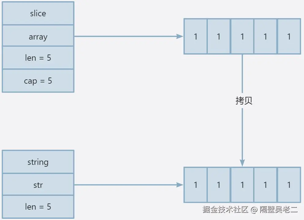 其实就是深拷贝,string转byte切片也是同理,我就不介绍了,注意换成byte切片之后,切片的cap=len。