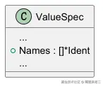 换句话说,ValueSpec代表的是const块中的每一行声明。例如,在给定的const块中有3个ValueSpec实例,每个实例对应一行声明。而Names字段则表示该行声明中定义的所有常量名称。比如,在第一行声明中如果有两个常量(如A和B),那么这一行对应的ValueSpec.Names的长度就是2。这样在回头看编译期的伪代码是不是就理解很多了?