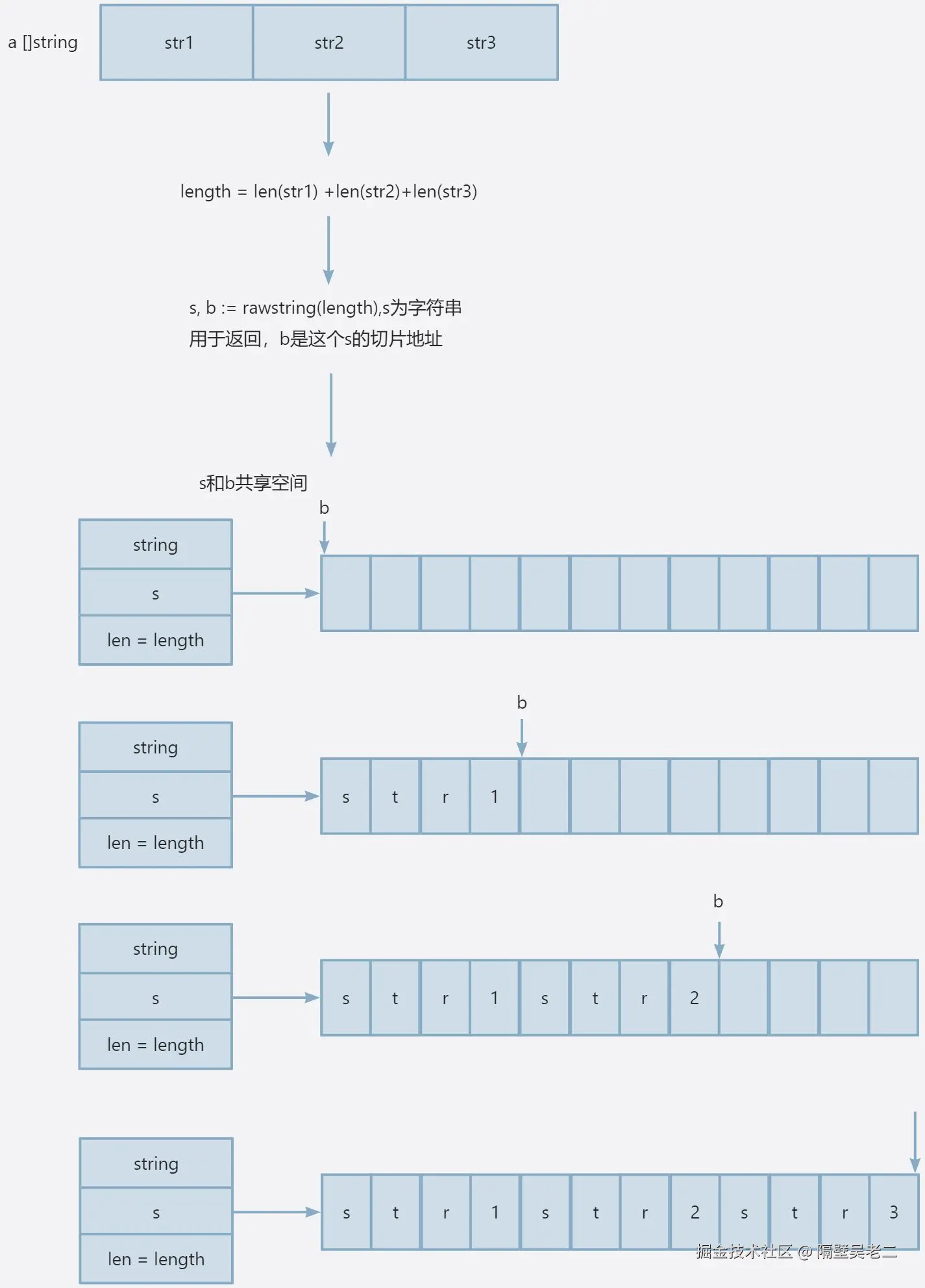 一个拼接语句的字符串编译时都会被存放到一个切片中,拼接过程需要遍历两次切片,第一次遍历获取总的字符串长度,据此申请内存,第二次遍历会把字符串逐个拷贝过去。 字符串拼接伪代码如下: