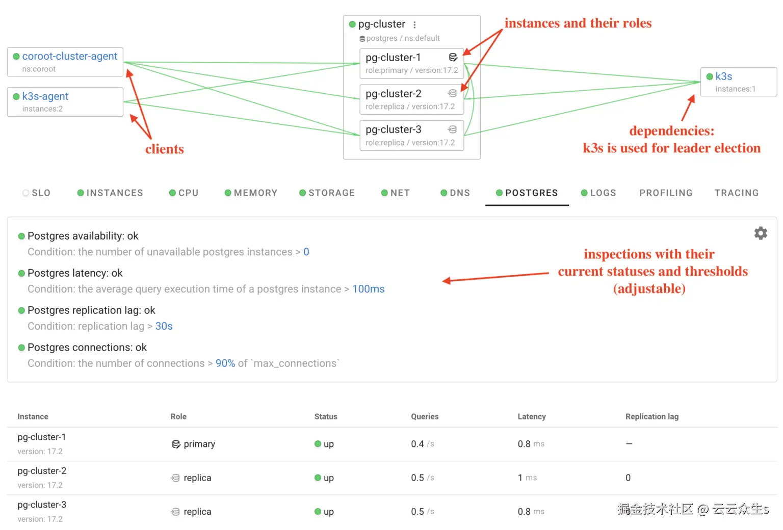 接下来,在集群规范中提供为 Coroot 配置的凭据。Coroot 的集群代理将从集群中的每个实例收集 Postgres 指标。我们在集群创建期间启用的 pg_stat_statements 扩展已经设置好了,因此无需手动步骤。由于 Coroot 了解 Kubernetes 应用程序的动态特性,它会自动检测所有实例,即使您添加更多副本也是如此。