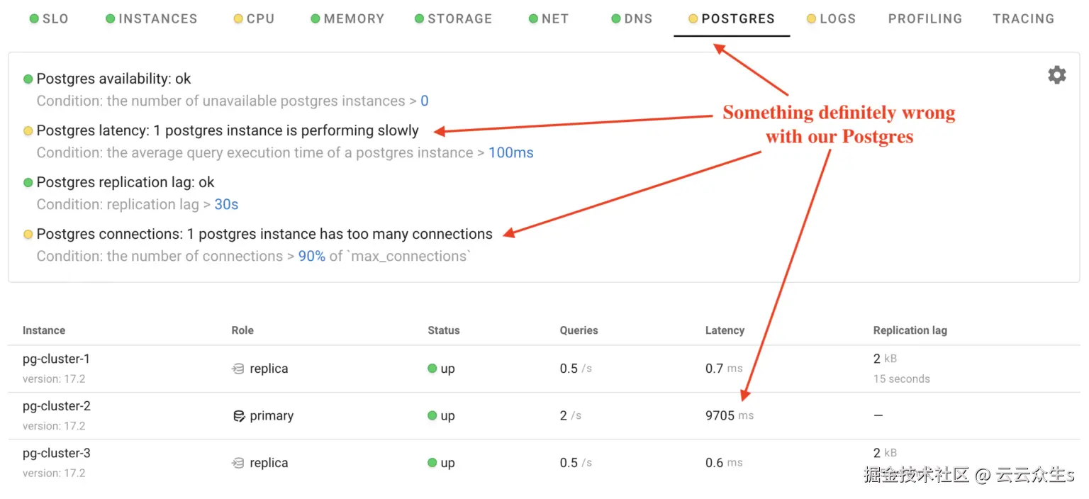 就是这样!在一分钟内,我们的 Postgres 集群将由 Coroot 完全监控。这不仅仅是在 Prometheus 中有一些 Postgres 指标。我们现在拥有所有内容:指标、日志、跟踪、概要文件、仪表板和预定义的检查,这些检查会自动突出显示任何性能问题或数据库不可用情况。
