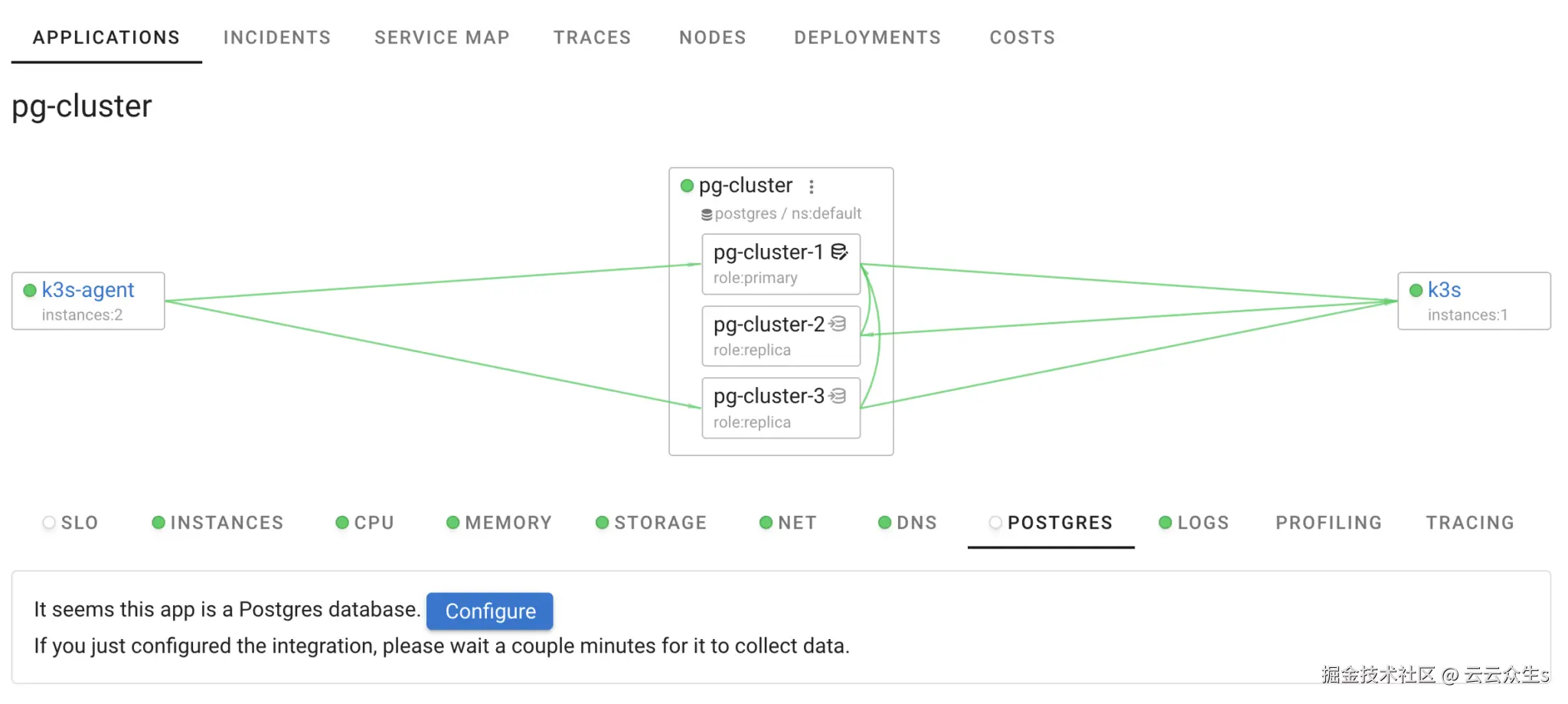 在UI中,我们可以看到两个应用程序:Operator (cnpg-cloudnative-pg)和我们的Postgres集群(pg-cluster)。Coroot还识别出pg-cluster是一个Postgres数据库,并建议集成Postgres监控。