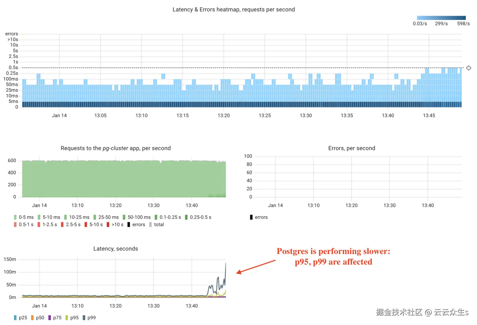 让我们一起解释这些图表:pg-cluster-2 的 Postgres 延迟显着增加。许多 SELECT 和 INSERT 查询被另一个查询锁定。哪个?ALTER TABLE 查询。为什么此查询需要这么长时间才能执行?因为它正在执行 I/O 操作以验证每一行中的 body 列是否不为 NULL。