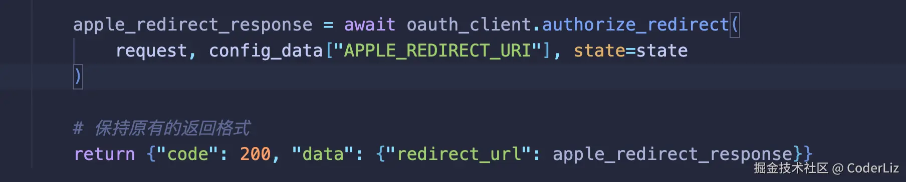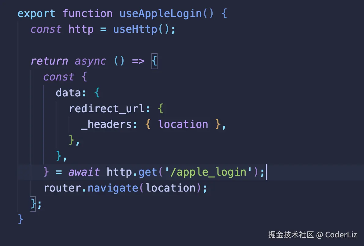 调用后端的苹果登录接口,后端实现就是使用oauth_client来获取用户的授权,然后返回一个重定向地址,这个地址就是Apple 的登录页面,在这里用户完成授权登录
