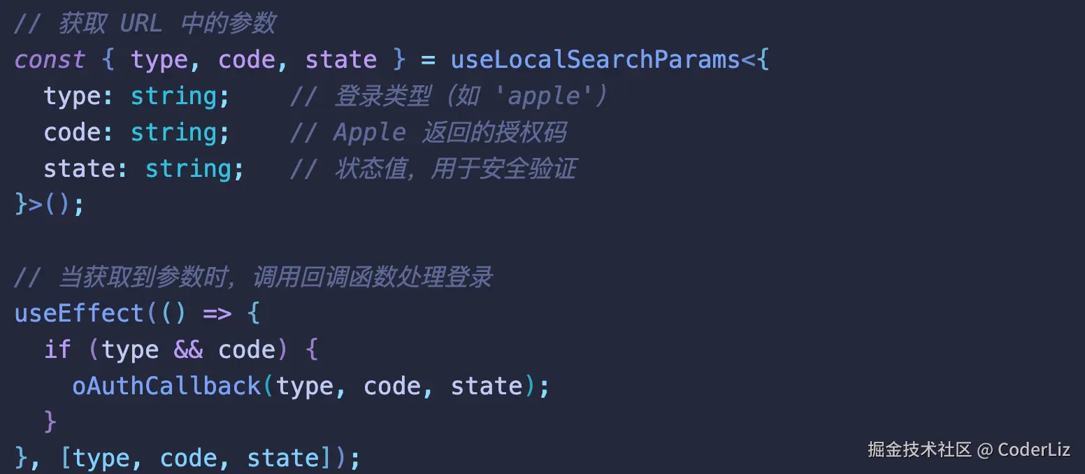 在用户完成 Apple 登录后,Apple 会将用户重定向回您的应用,并带上 code、state 等参数