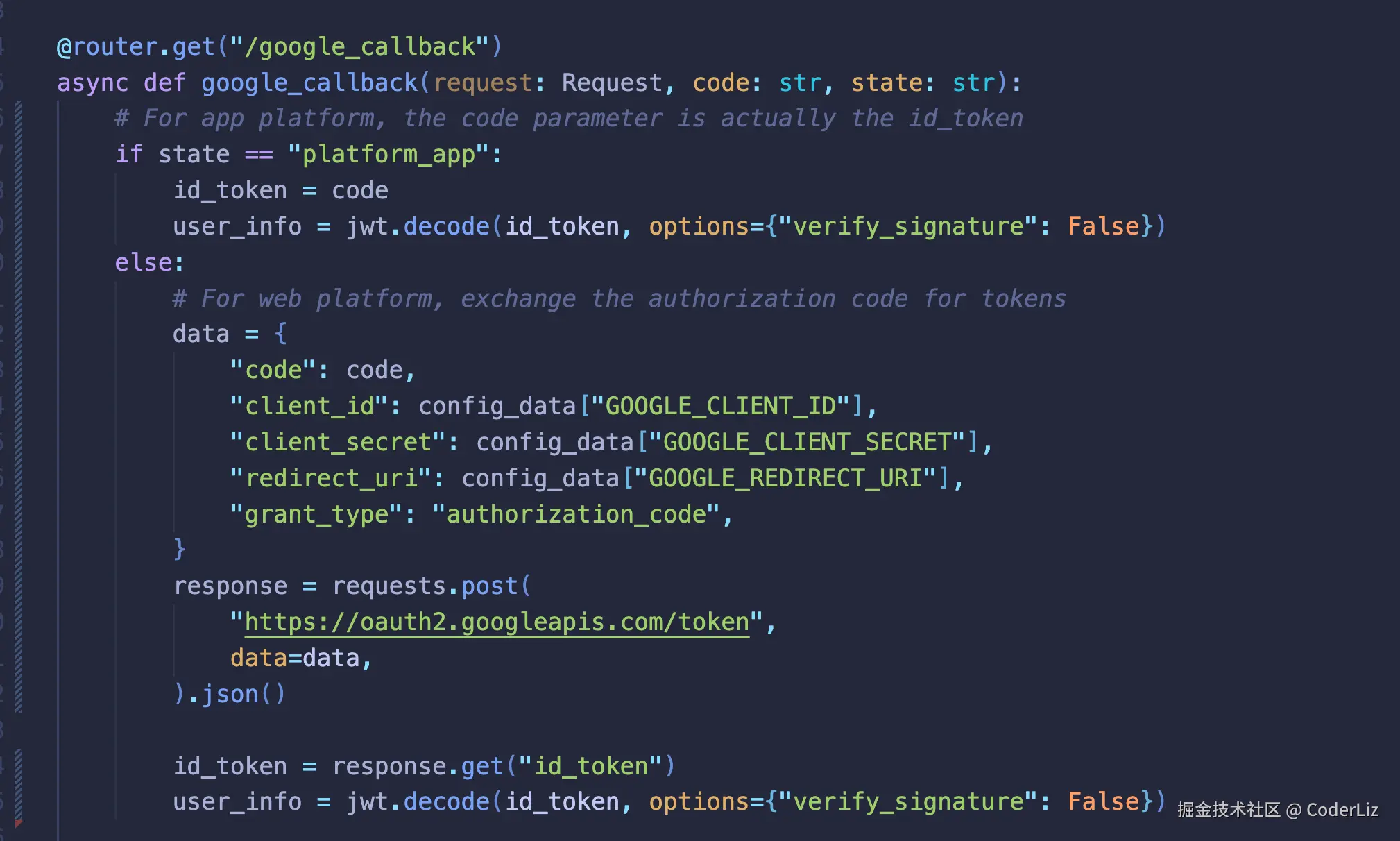 然后拿到这个idtoken,还要修改后端来适配app端的登录,加参数app的state参数到后端来识别,网页端和app端不同的处理,网页端还多一步: