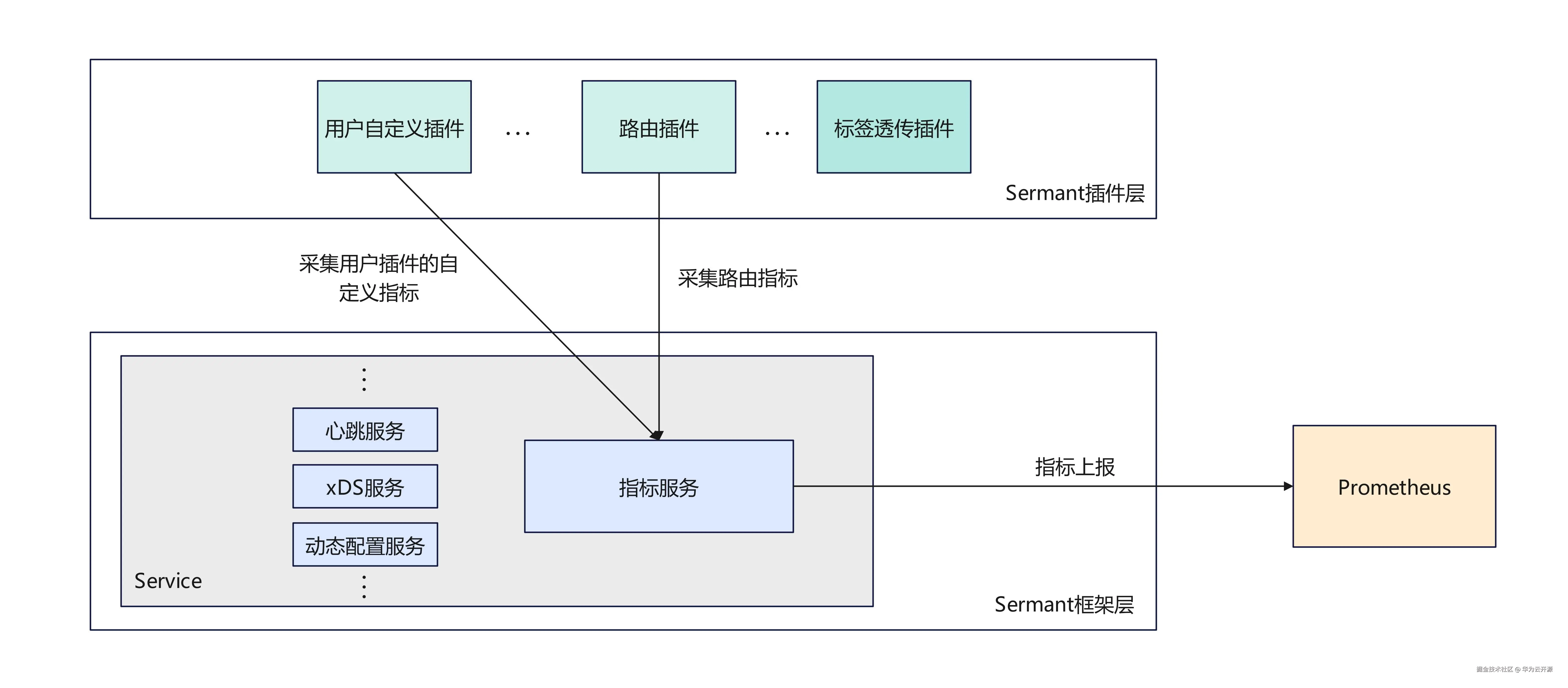 为满足用户对Sermant运行状态和性能的实时监控需求,以及对插件行为的深入洞察,Sermant2.1.0版本发布了指标服务的Beta版本,在经过社区的验证和不断优化后,本次版本正式发布指标服务,其实现架构如下图所示: