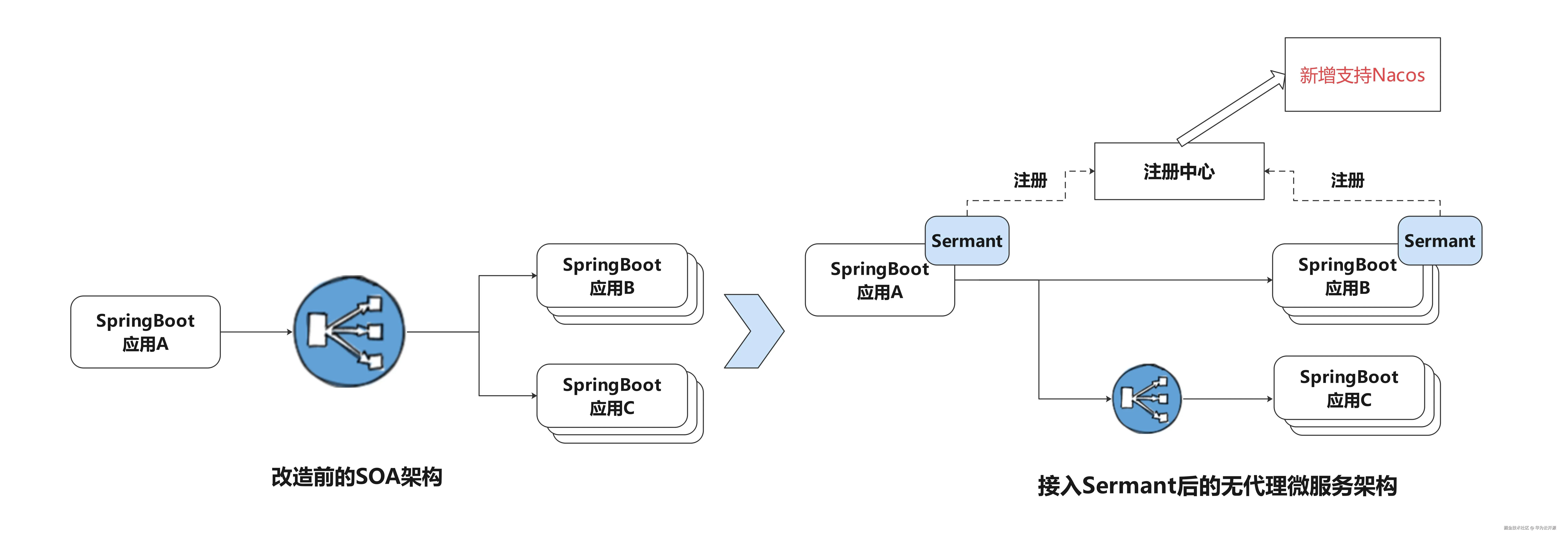 • 服务治理功能升级只需更新Sermant,业务应用不用重新出包,降低升级成本。