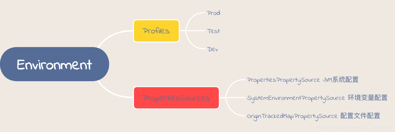 - Property:PropertySources,各种配置源。一个环境中可能有多个配置源,每个配置源有许多配置项。查询配置信息时,按配置源优先级进行查询