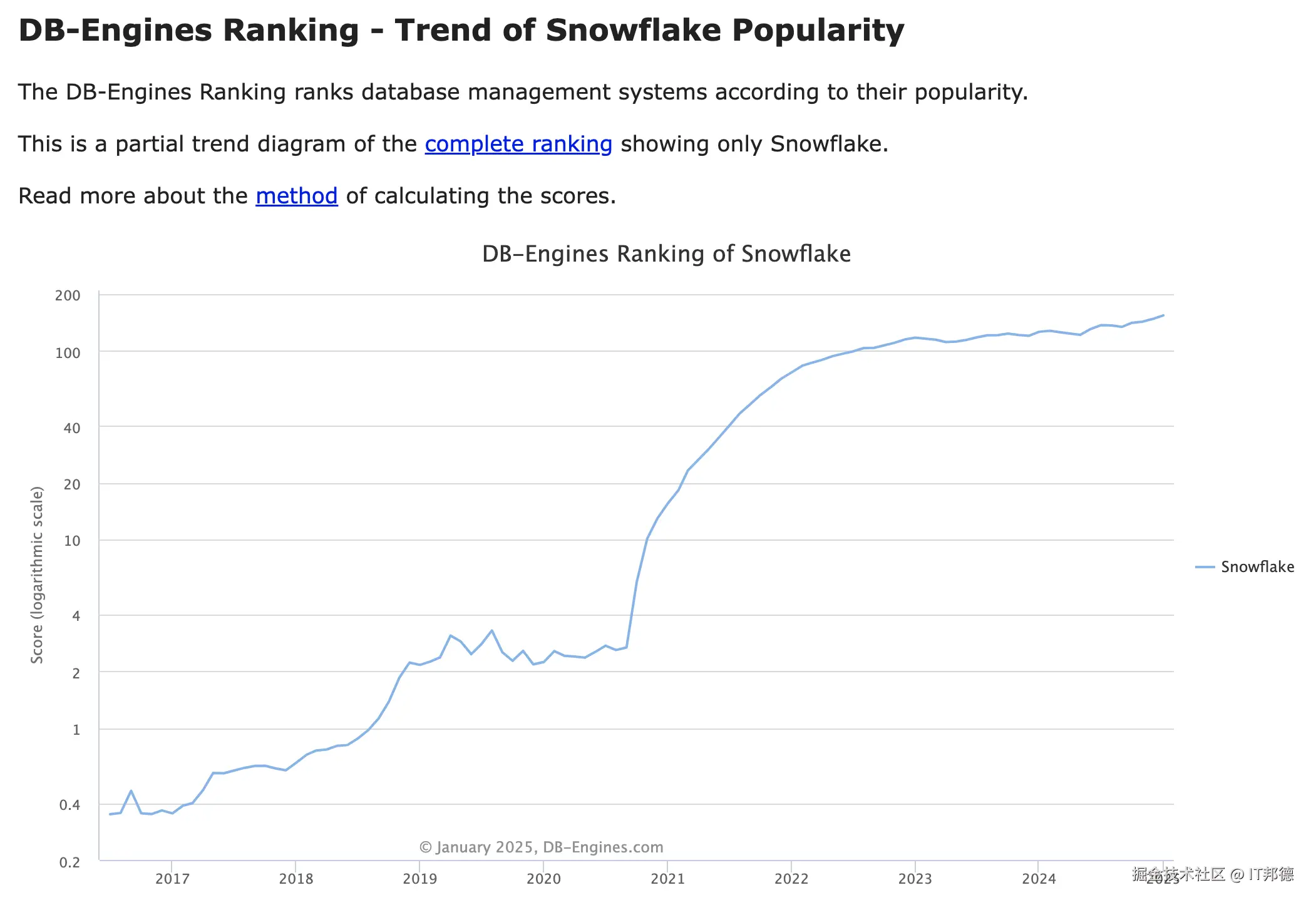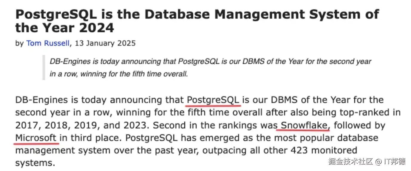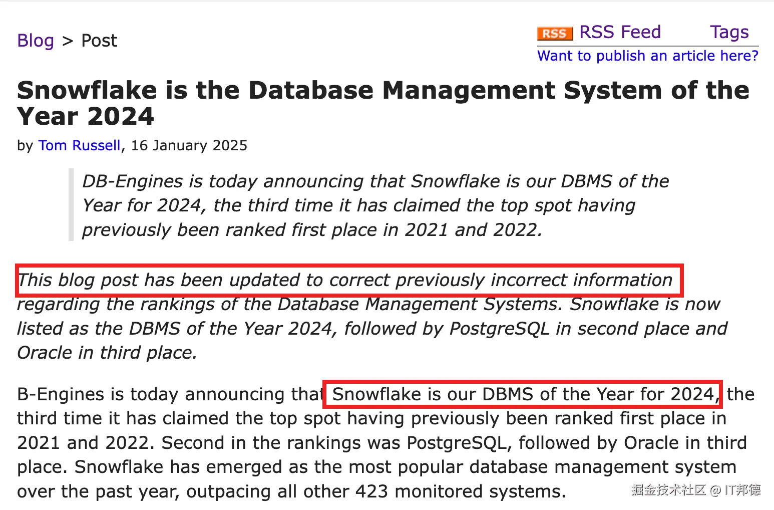 全球数据库排名权威网站DB-Engines,2025年1月16日紧急发文,做了纠正,最新的前三排名是 Snowflake, PostgreSQL, Oracle。