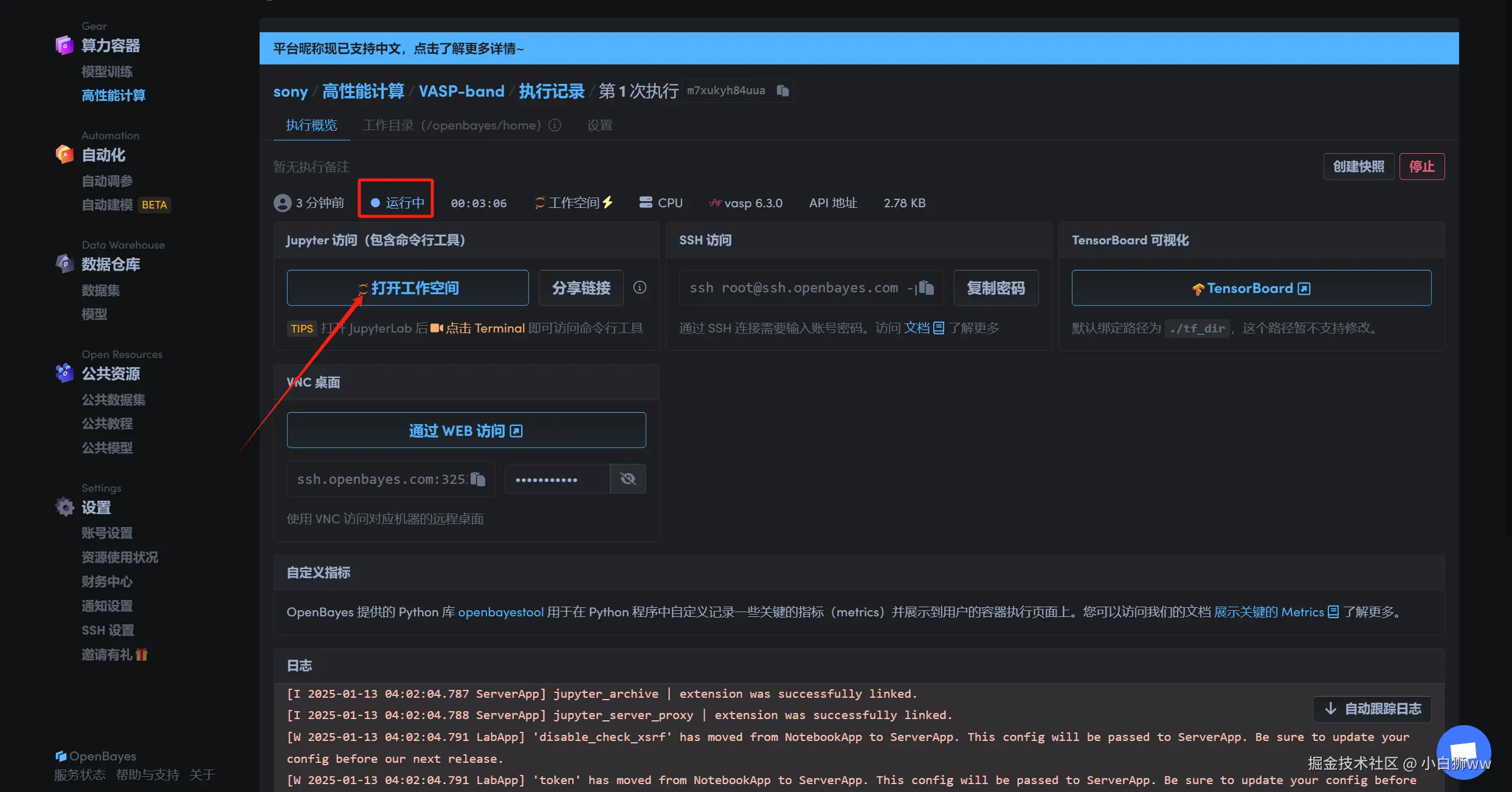 - 等待模型分配好资源,状态变为「运行中」后,点击「打开工作空间」。