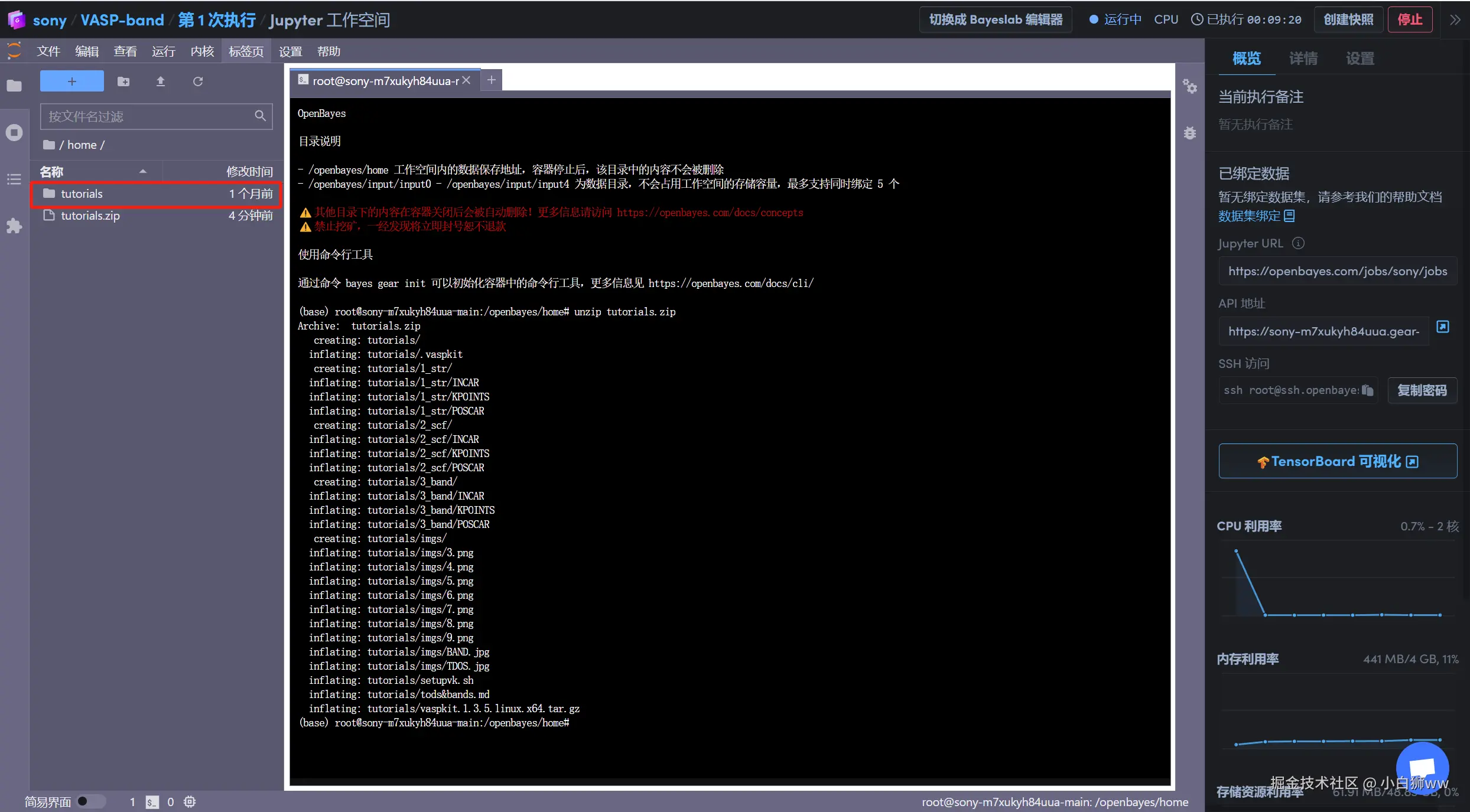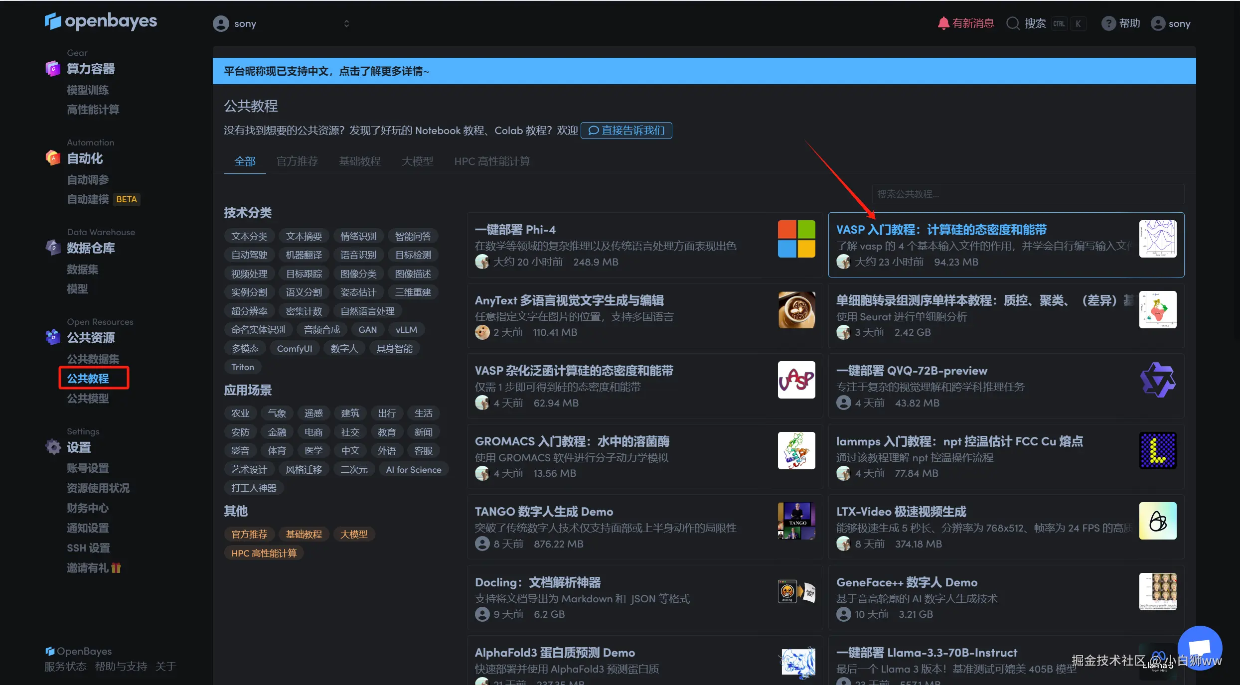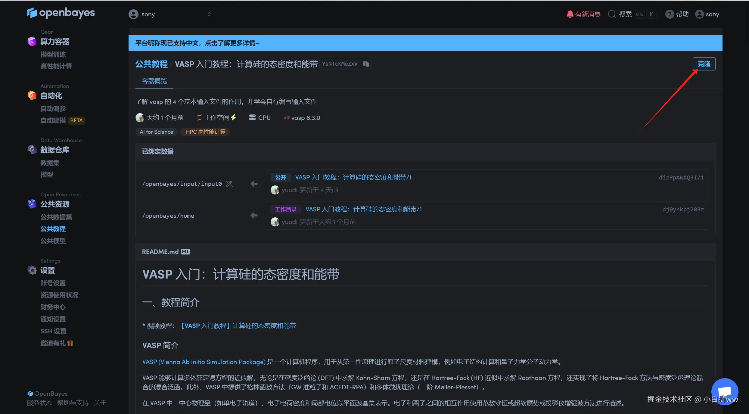 - 登录 OpenBayes.com,在「公共教程」页面,选择「VASP 入门教程:计算硅的态密度和能带」教程。
