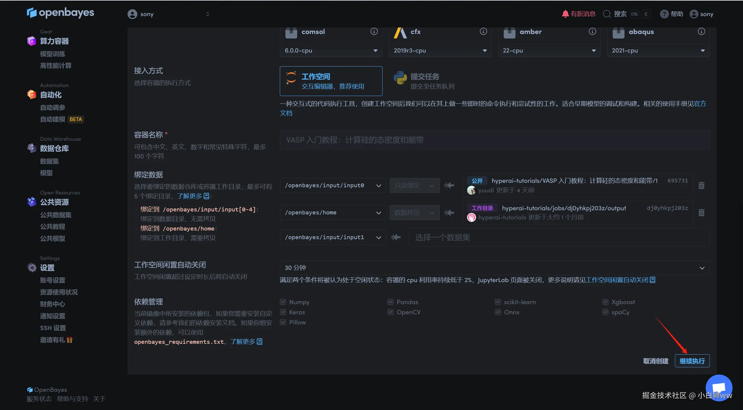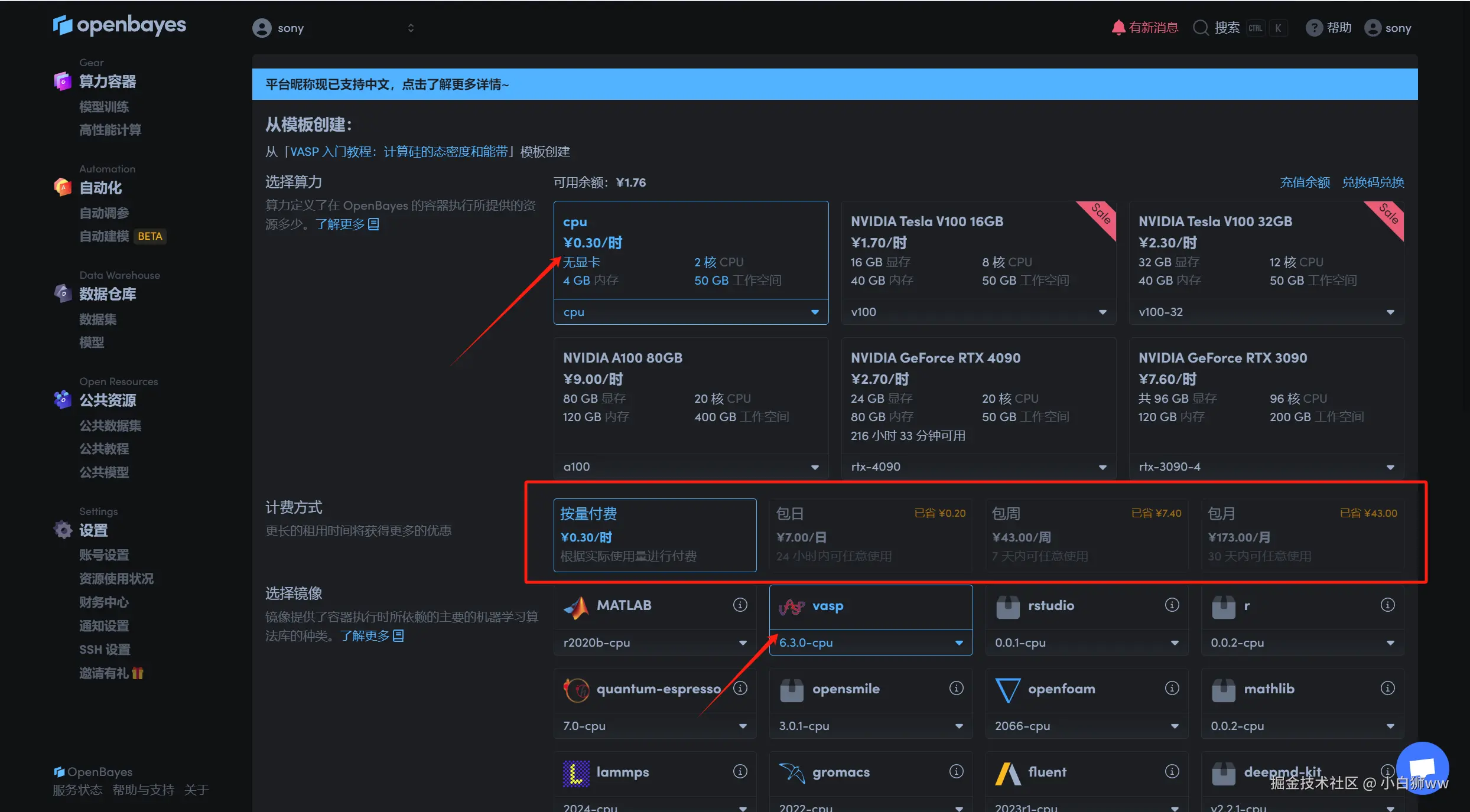 - 在「选择算力」处选择「cpu」,镜像选择「vasp」,OpenBayes 平台上线了新的计费方式,大家可以按照需求选择「按量付费」或「包日/周/月」,点击「继续执行」。新用户使用下方邀请链接注册,可获得 4 小时 RTX 4090 + 5 小时 CPU 的免费时长!