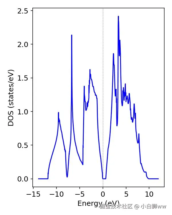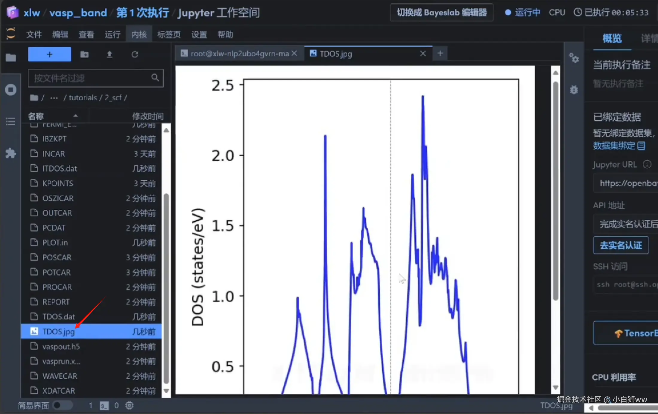 cd 2_scf」,进入「2_scf」。输入以下代码使用 vaspkit 处理数据并绘图。等待运行完成后,可以在目录中找到生成出的图片,即硅的态密度图片。