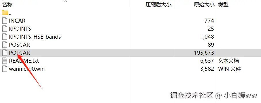 - 将我们提前准备好的赝势上传到「1_str」中。这里可以使用「官网示例:www.vasp.at/wiki/images… 」里的赝势「POTCAR」。
