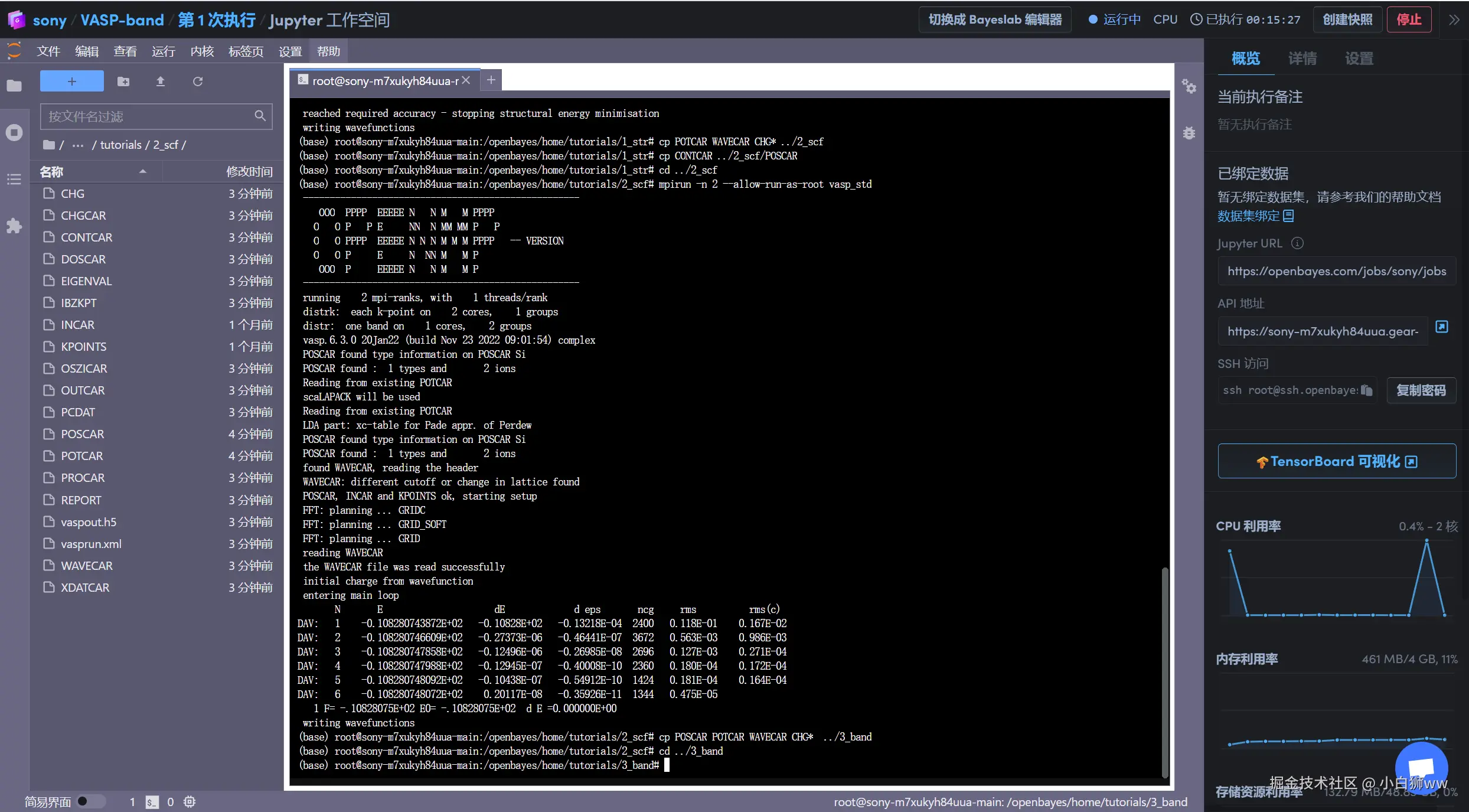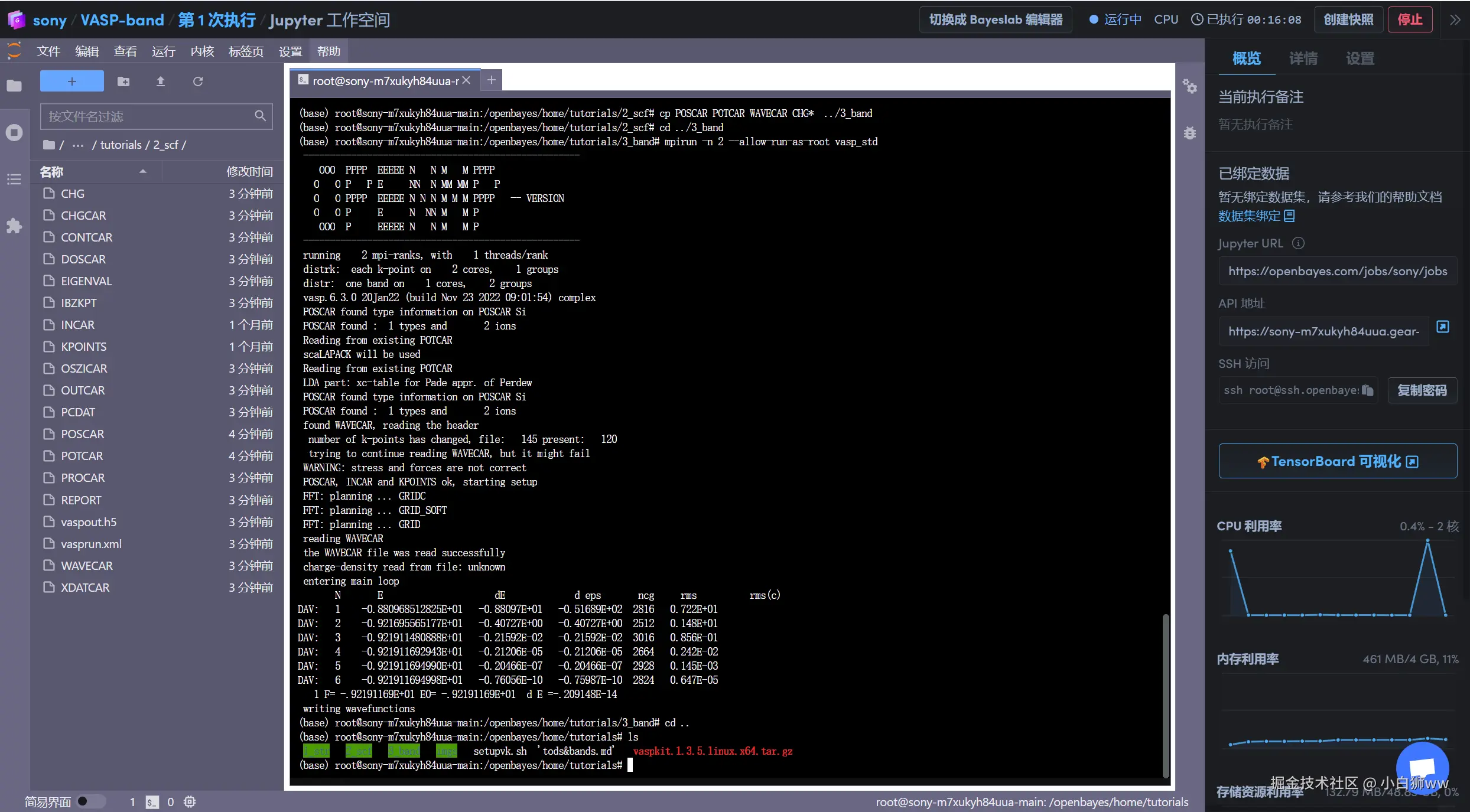 mpirun -n 2 --allow-run-as-root vasp_std」运行,这时 vasp 会读取上一步复制过来的 WAVECAR、CHGCAR 和 CHG,进行本征值计算。