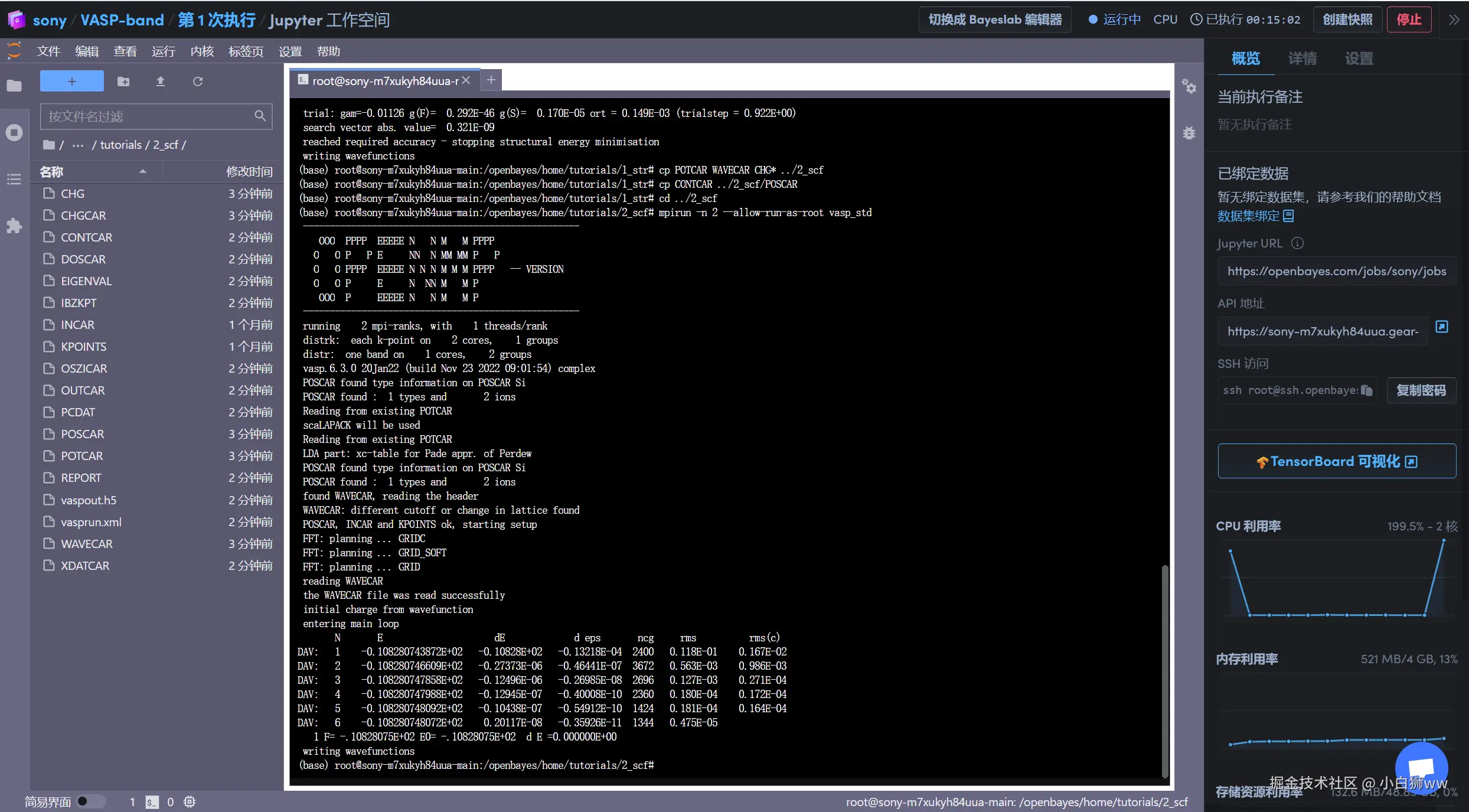 mpirun -n 2 --allow-run-as-root vasp_std」,这时 vasp 会读取上一步复制过来的 WAVECAR 和 CHGCAR。