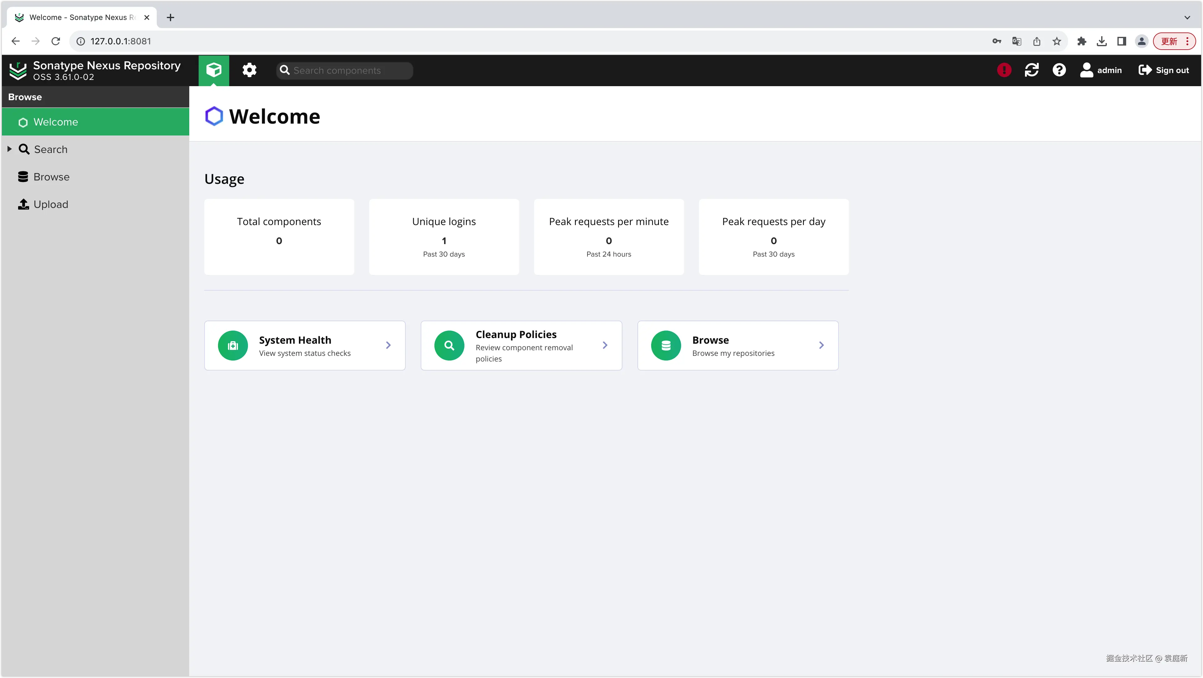 1.当Nexus启动完成后,在浏览器地址栏输入http://localhost:8081或http://127.0.0.1:8081地址来访问Nexus界面,如下图所示。