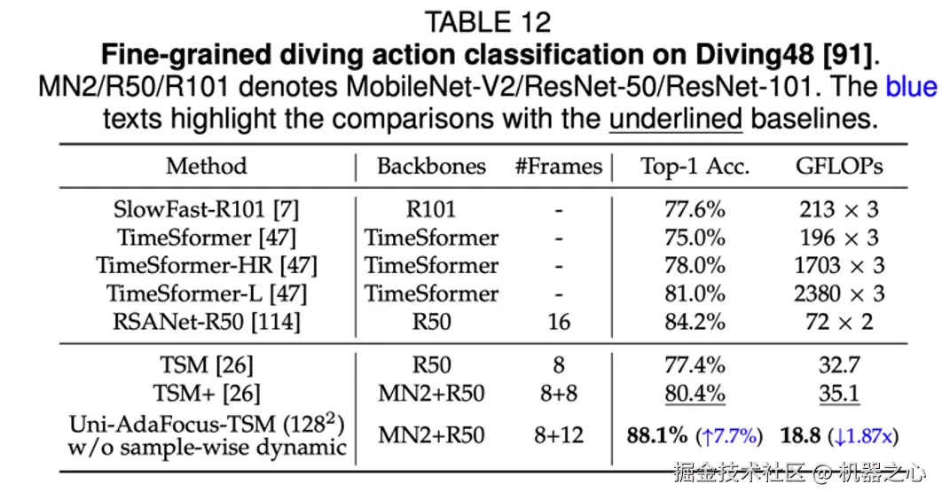 在 7 个学术数据集(ActivityNet, FCVID, Mini-Kinetics, Sth-Sth V1&V2, Jester, Kinetics-400)和 3 个应用场景(使用脑 MRI 诊断阿尔兹海默症和帕金森综合征、细粒度跳水动作识别、互联网不良视频检测)上进行了验证,Uni-AdaFocus 发挥稳定,特定典型情况下可实现多达 23 倍的(性能无损)推理加速或高达 7.7% 的准确性提升。