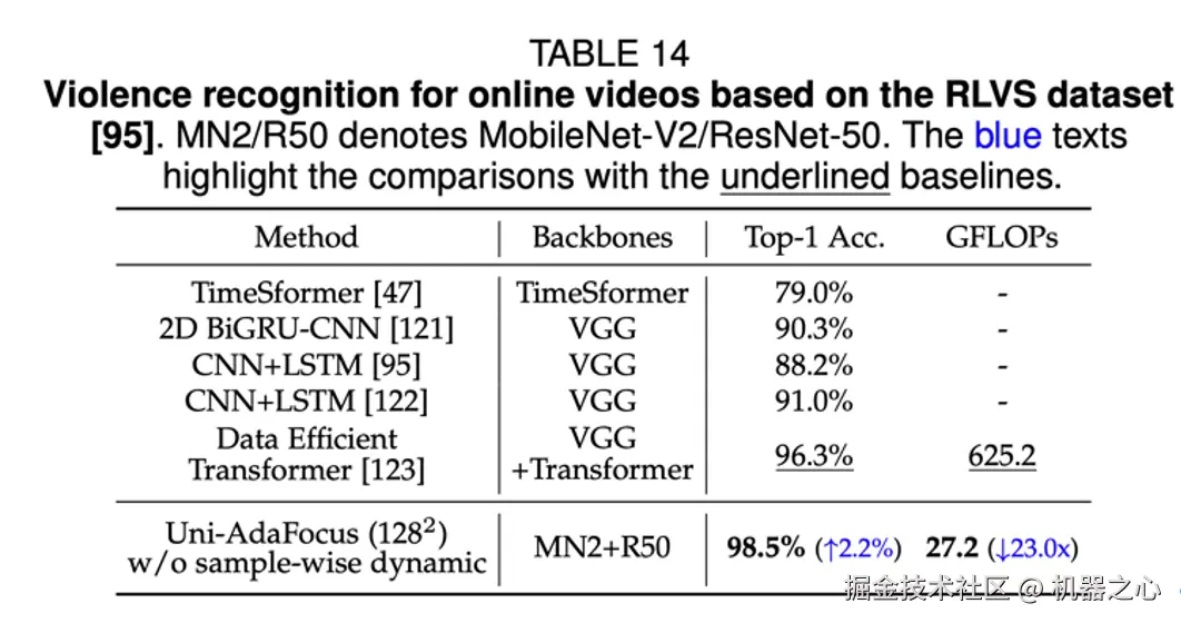 使用 MobileNet-V2 和 ResNet-50 为 backbone, Uni-AdaFocus 在 ActivityNet,FCVID 和 Mini-Kinetics 上的实验结果,以及与现有最佳同类方法的比较。