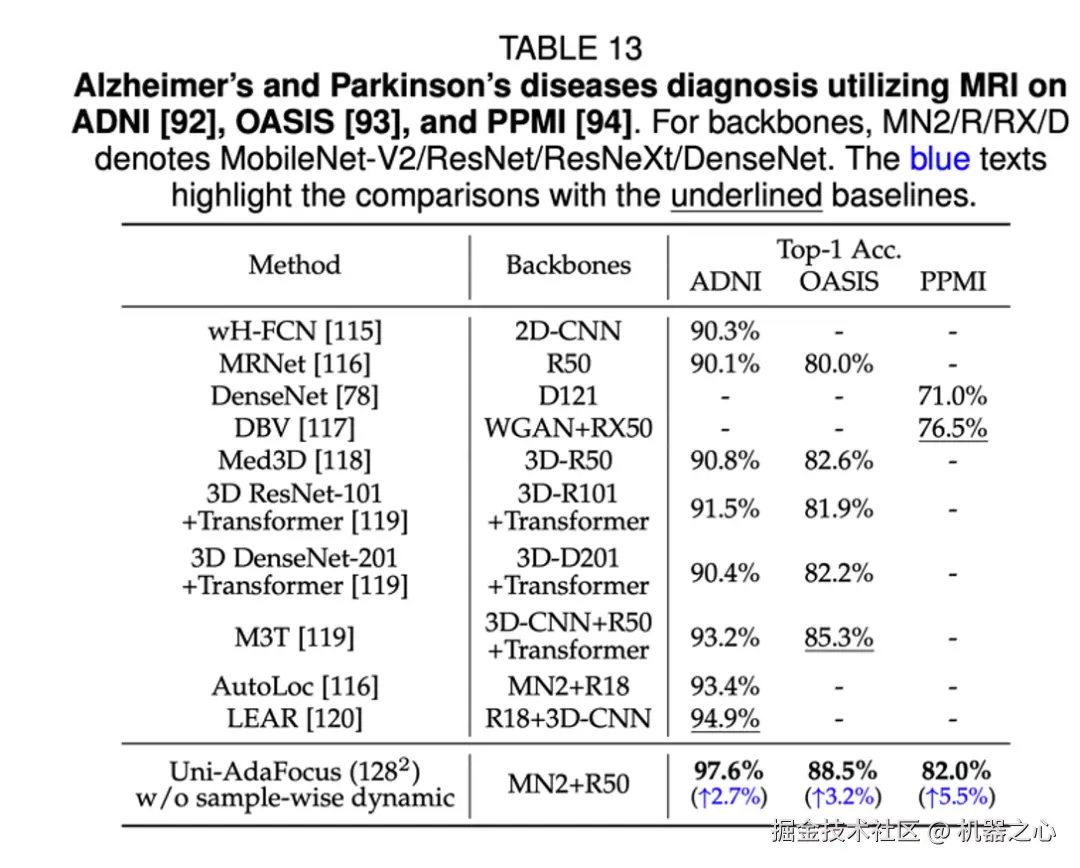 Uni-AdaFocus 在 3 个应用场景(使用脑 MRI 诊断阿尔兹海默症和帕金森综合征、细粒度跳水动作识别、互联网不良视频检测)上的实验结果。