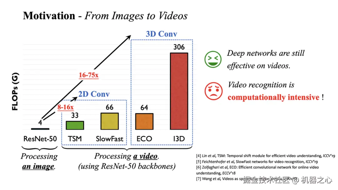 近年来,已有很多基于深度神经网络的视频理解算法取得了较佳的性能,如 TSM、SlowFast、I3D、X3D、ViViT 等。然而,一个严重的问题是,相较于图像,使用深度神经网络处理视频通常会引入急剧增长的计算开销。如下图所示,将 ResNet-50 应用于视频理解将使运算量(FLOPs)扩大 8-75 倍。